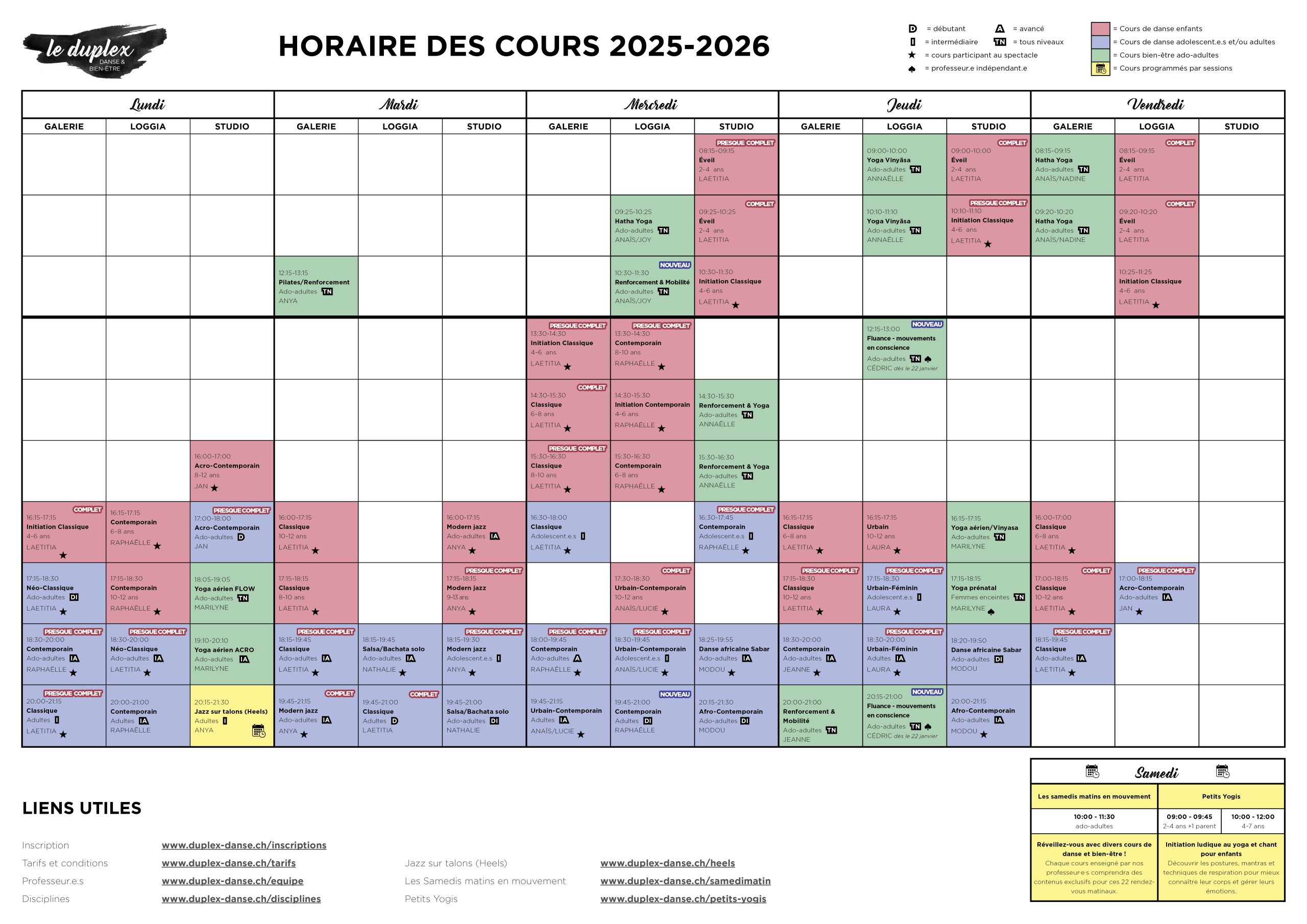 Inscription en ligne Tu souhaites essayer un/des cours avant de t'inscrire ? Je m'annonce ici pour un essai ! Horaire mis à jour le : 09.10.2025 Le formulaire d'inscription (sous abonnement annuel) vous indiquera le nombre exact de places restantes pour chaque cours.
